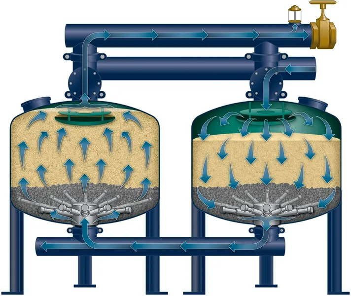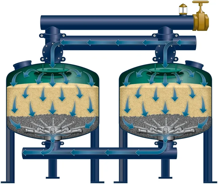 - Particulate is trapped and retained within the media bed, resulting in clean process water flowing out through the stainless steel wedgewire underdrain to the outlet of each filter tank and to the outlet manifold for end use.