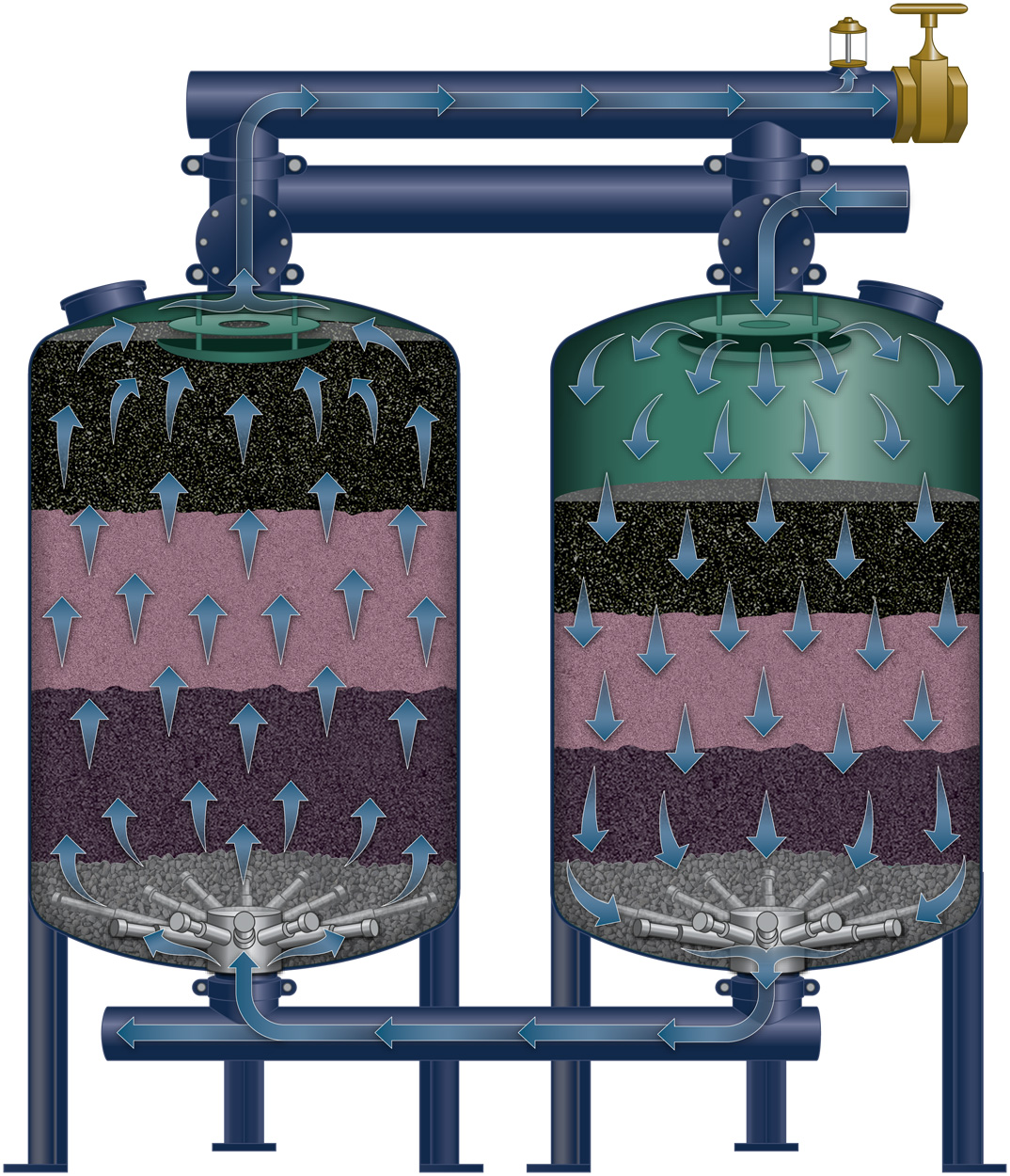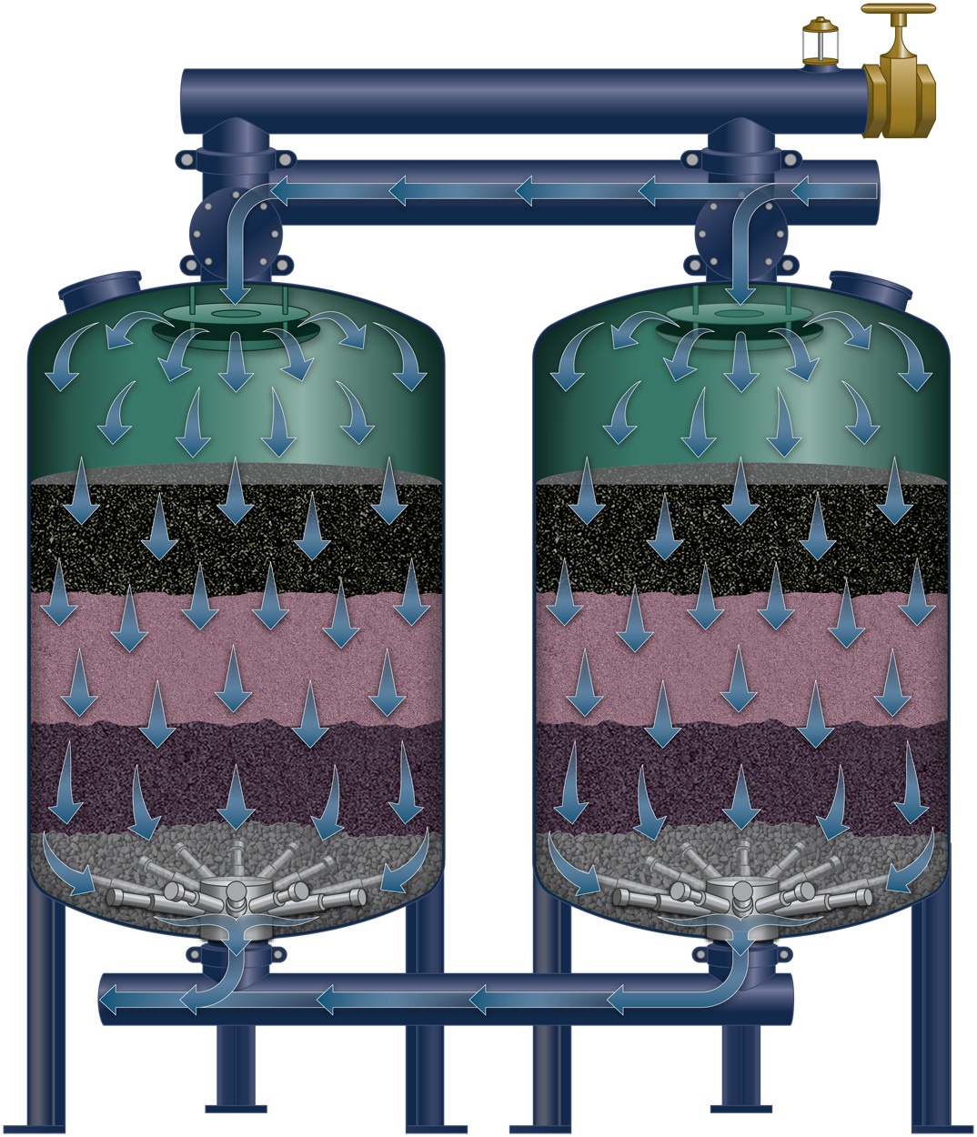 - Removal of organic and/or inorganic suspended solids down to 5 microns with enhanced solids capacity vs. single media sand filtration
