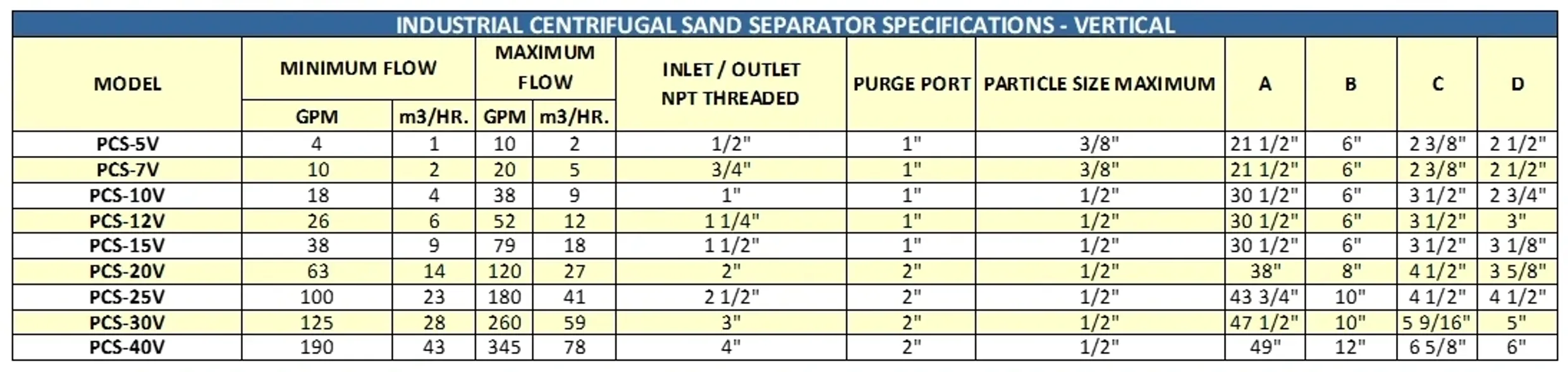 Yardney Centrifugal Sand Separators are ideal for removal of suspended solids and inorganic materials with a specific gravity of 2 or greater. This highly effective system will provide consistent, simple removal of inorganic material down to 75 microns. Easily installed, these carbon steel units are rated to 150 psi with threaded or flanged inlet and outlet connections. Smaller models are designed for vertical installation, while larger models are angled and floor or ground mounted. Larger flow separators and custom designed systems are available.