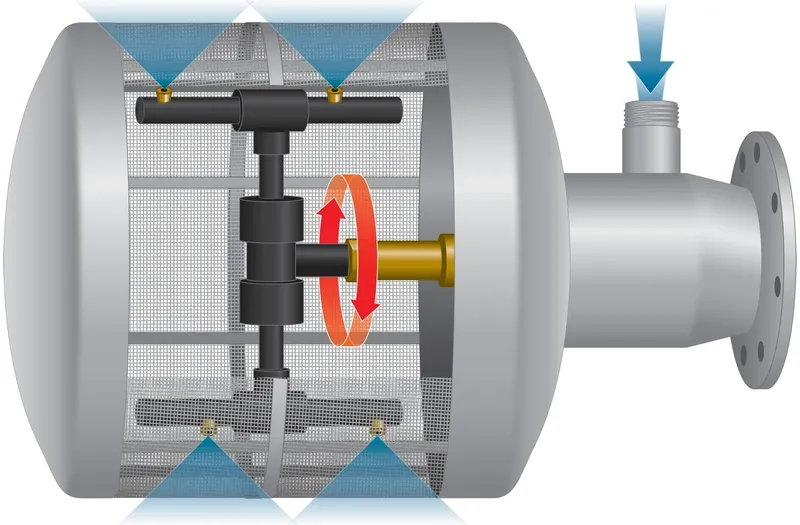 - Precision internal spray bars continually rotate and blast debris away from the screen