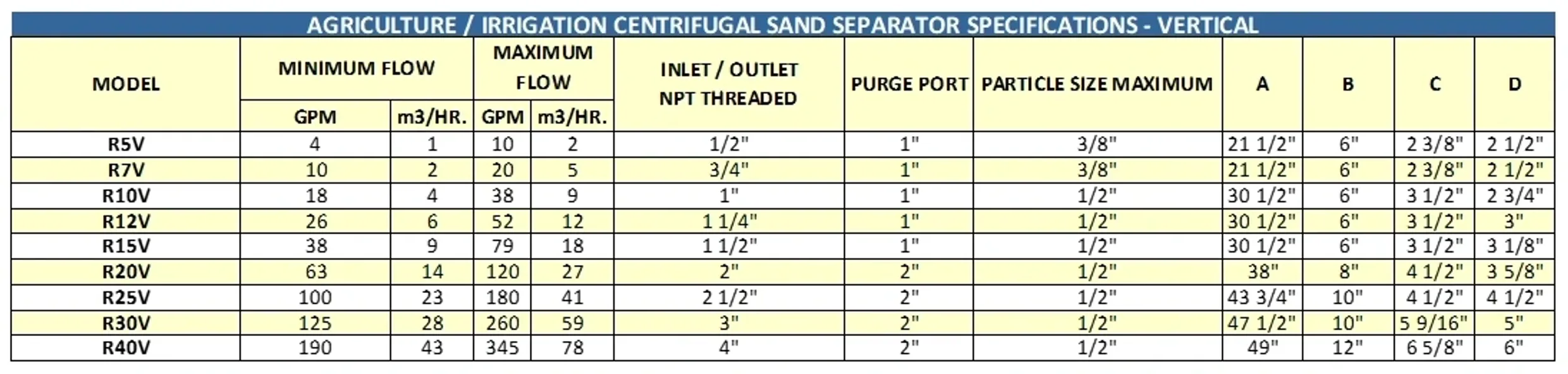 - Removal of sand, rock, grit and other inorganic contaminants to protect drip and micro-irrigation systems with fine mesh filtration down to 200 mesh or 75 microns